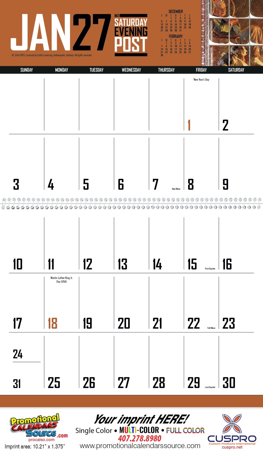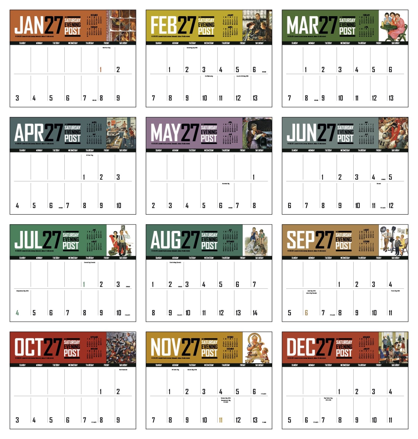 The Saturday Evening Post Big Memo Blocks Calendar. This calendar has big bold numbers, plenty of writing space and the nostalgic artwork from The Saturday Evening Post magazine. The perfect promotional calendar for your advertising.