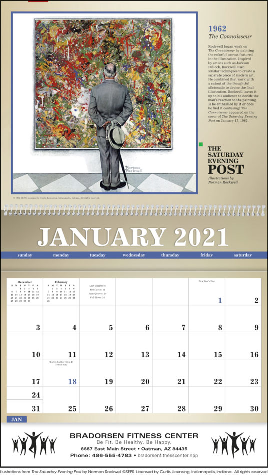 Our Deluxe Pocket reverse-collated calendar featuring The Saturday Evening Post Illustrations by Norman Rockwell profile segments of Americana throughout the year. Contact us with your design needs so we can assist you finalize the details of your calendar.