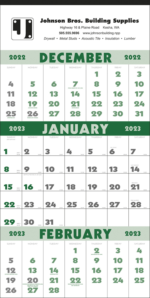 Calendar grids are pre-printed in Black & Green PMS 349. Your advertising copy will be printed on the Top portion of every sheet.