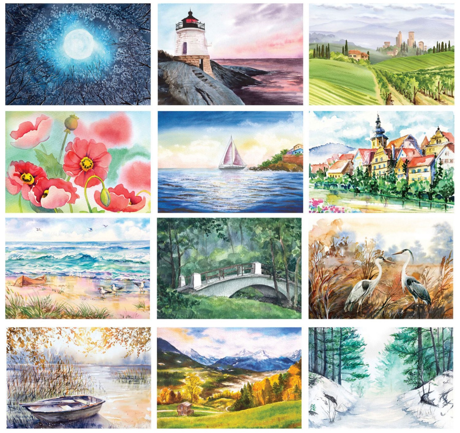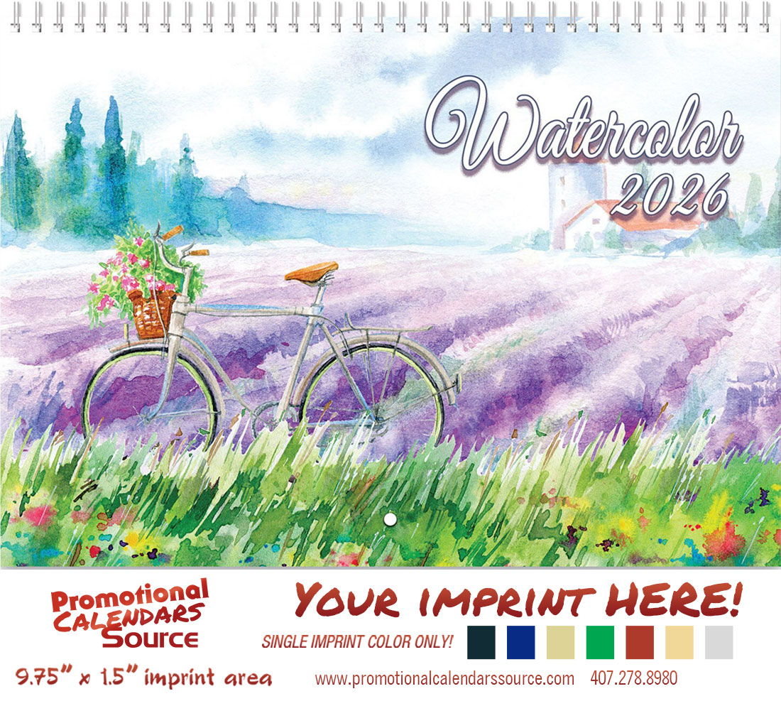 Scenic views reproduced using Water Color tecnique. A colorfull promotional calendar custom printed to advertise your business all year. Ideal for art lovers. Your ad copy printed on the back flap. 2023 Customized Promo Calendar.