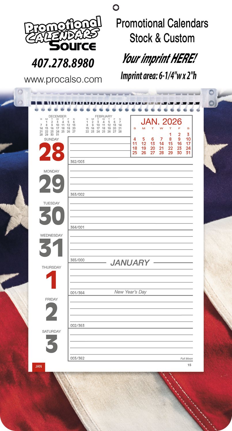 Big Numbers Promotional Weekly Memo Calendar - Patriotic. This Weekly Memo Calendar features large, bold numbers and solid grid lines make this an easy-to-read calendar. It has a sturdy wall mount board and spiral-bound pages on a hanging bar. Optional easel back is available at additional cost. Patriotic scene full color print background.