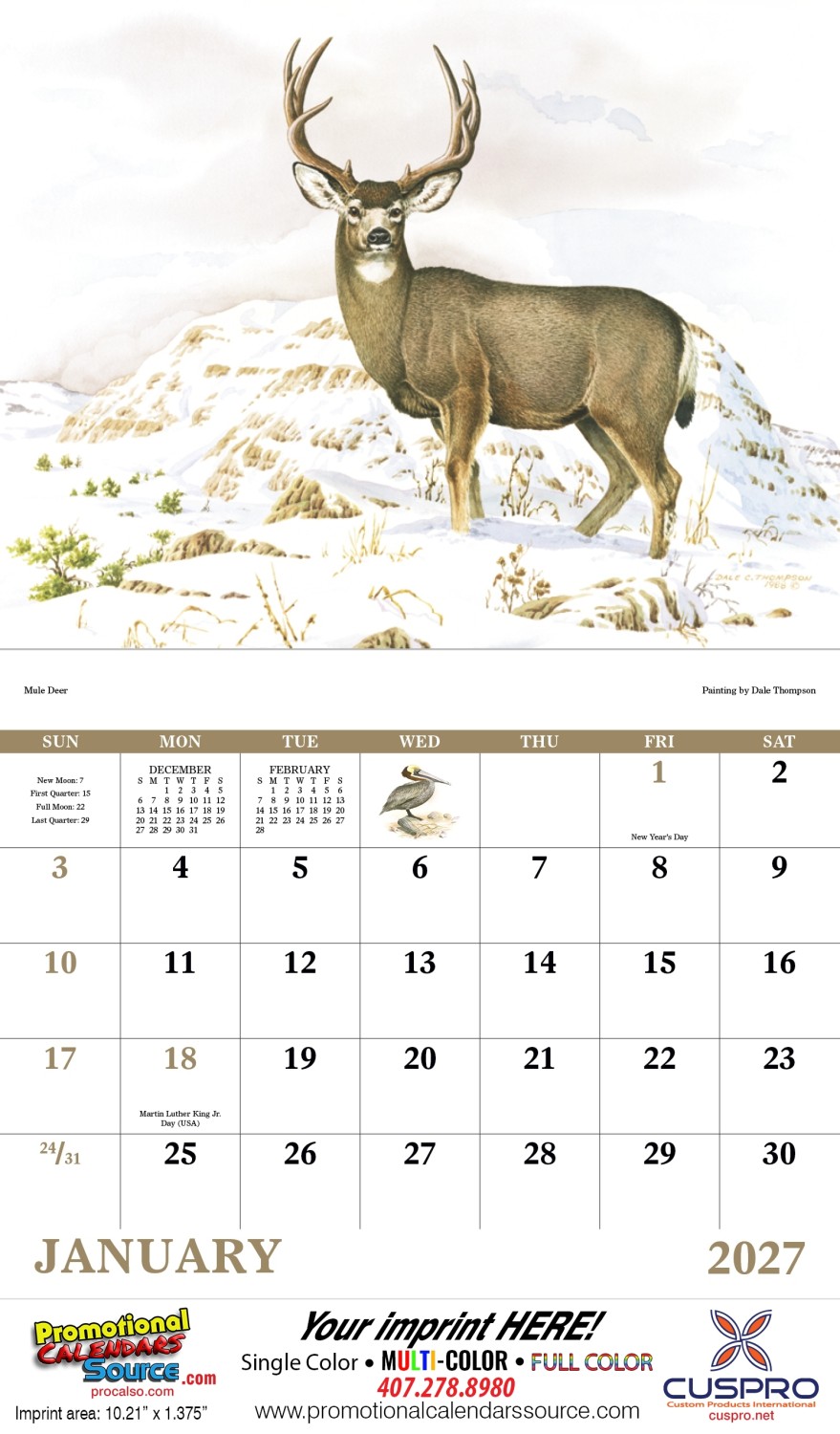Wildlife Trek Promotional Calendar with saddle stitched binding. Detailed wildlife paintings bring the outdoors inside with this 13 mont calendar. Great works of art portraying wildlife. 11x19 in. of exposure to make your business stand out and appreciatted all year round. A wild Life calendar.